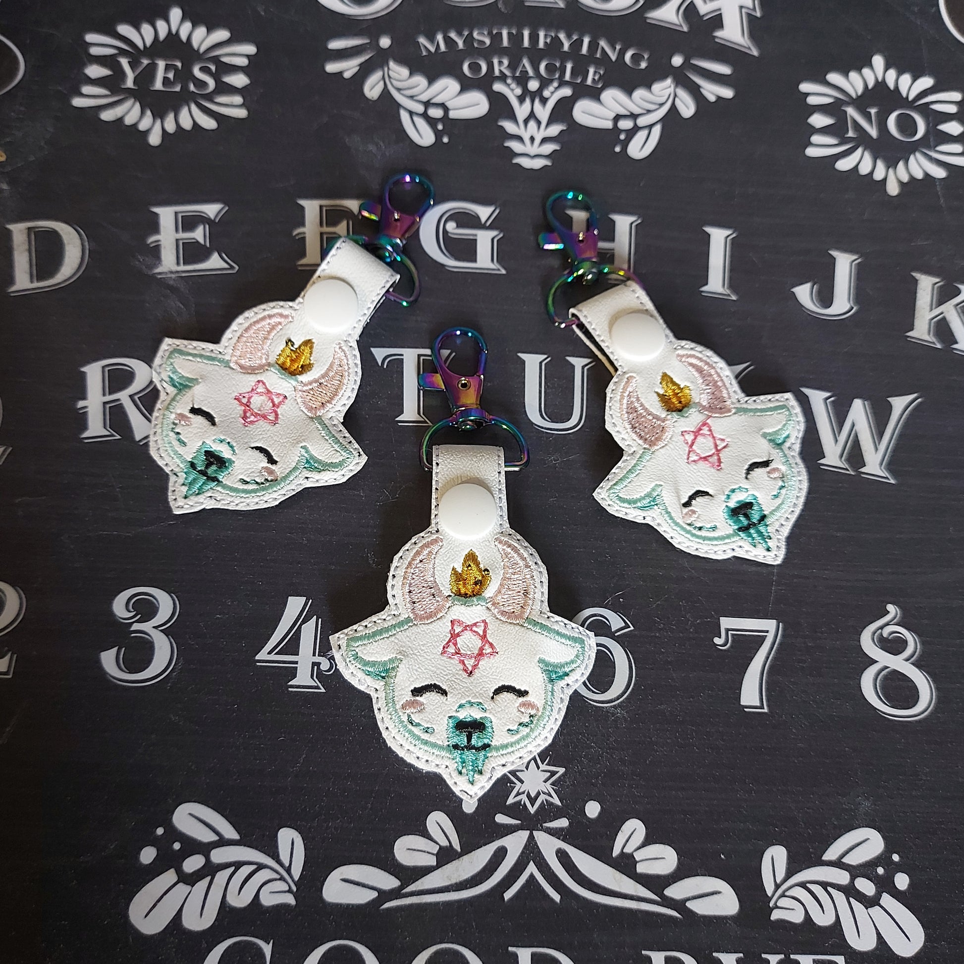 Made from white faux leather with multi coloured embroidery, these adorable chibi goat demons are perfect as a keyring or a bag tag. I added rainbow finish clips to these so you can clip them to a bag or belt.