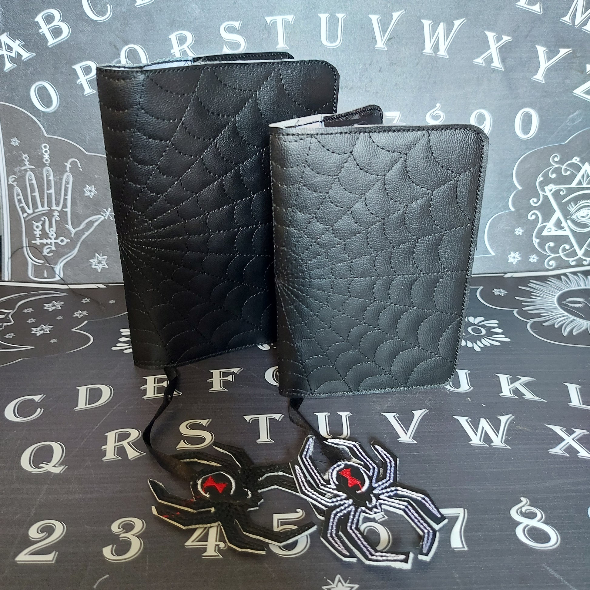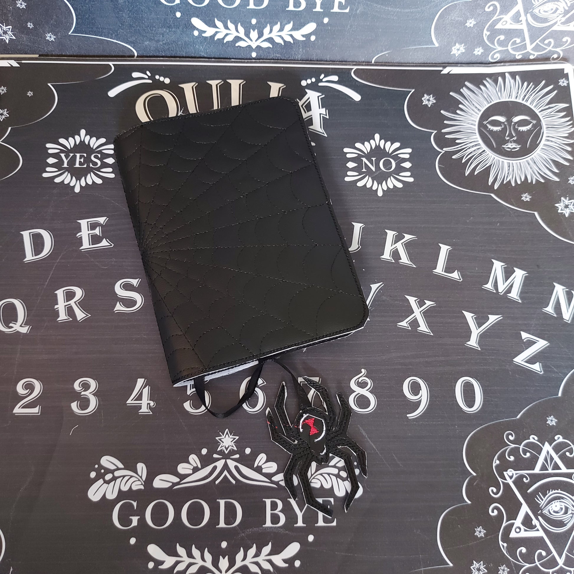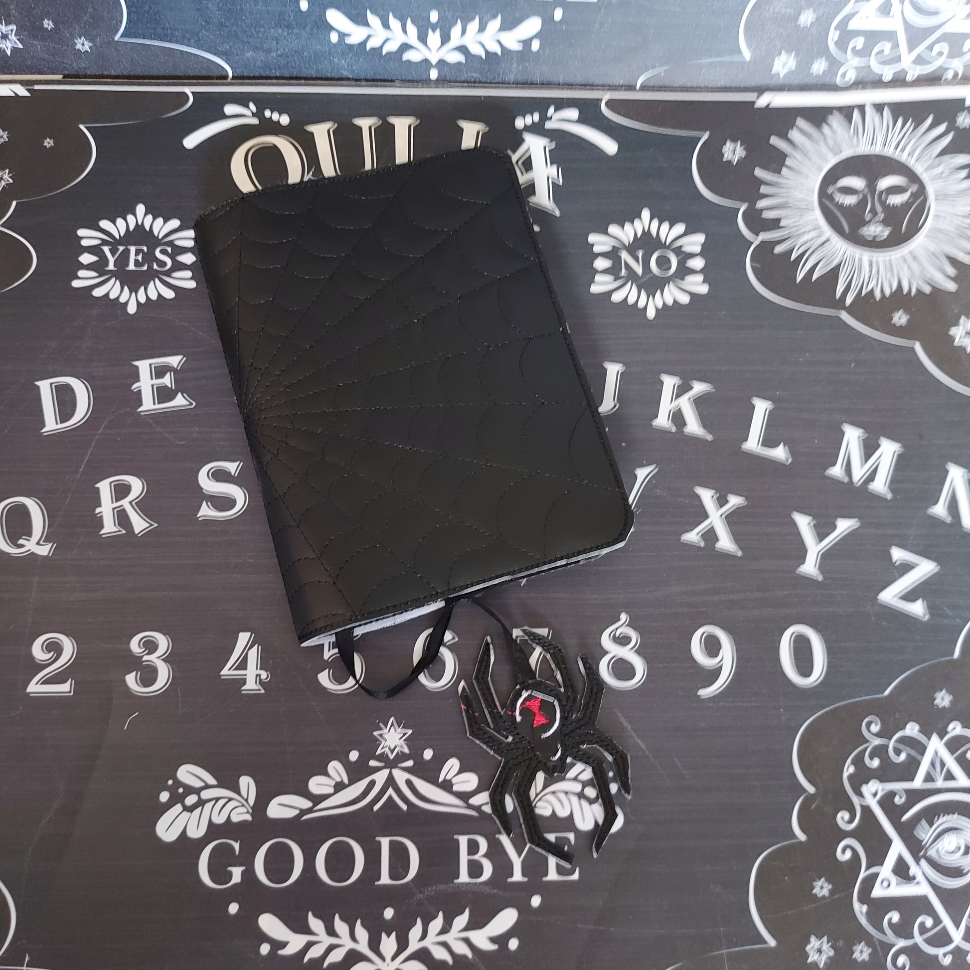 The cover is embroidered with a spiderweb and there is a bookmark featuring a tiny spider on a length of ribbon.